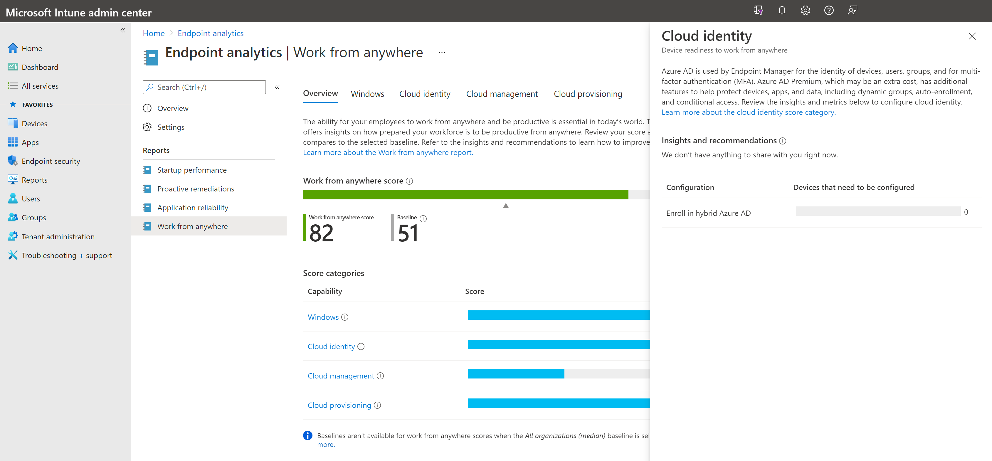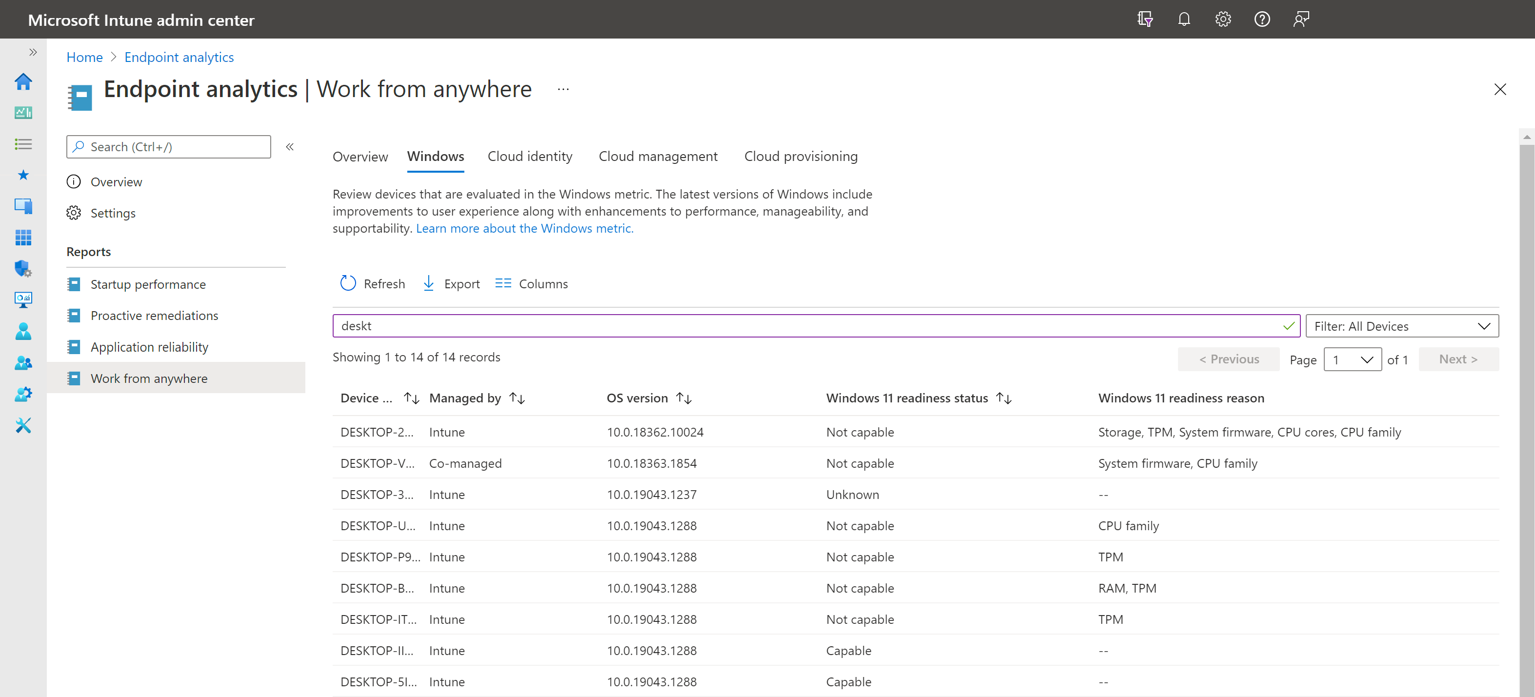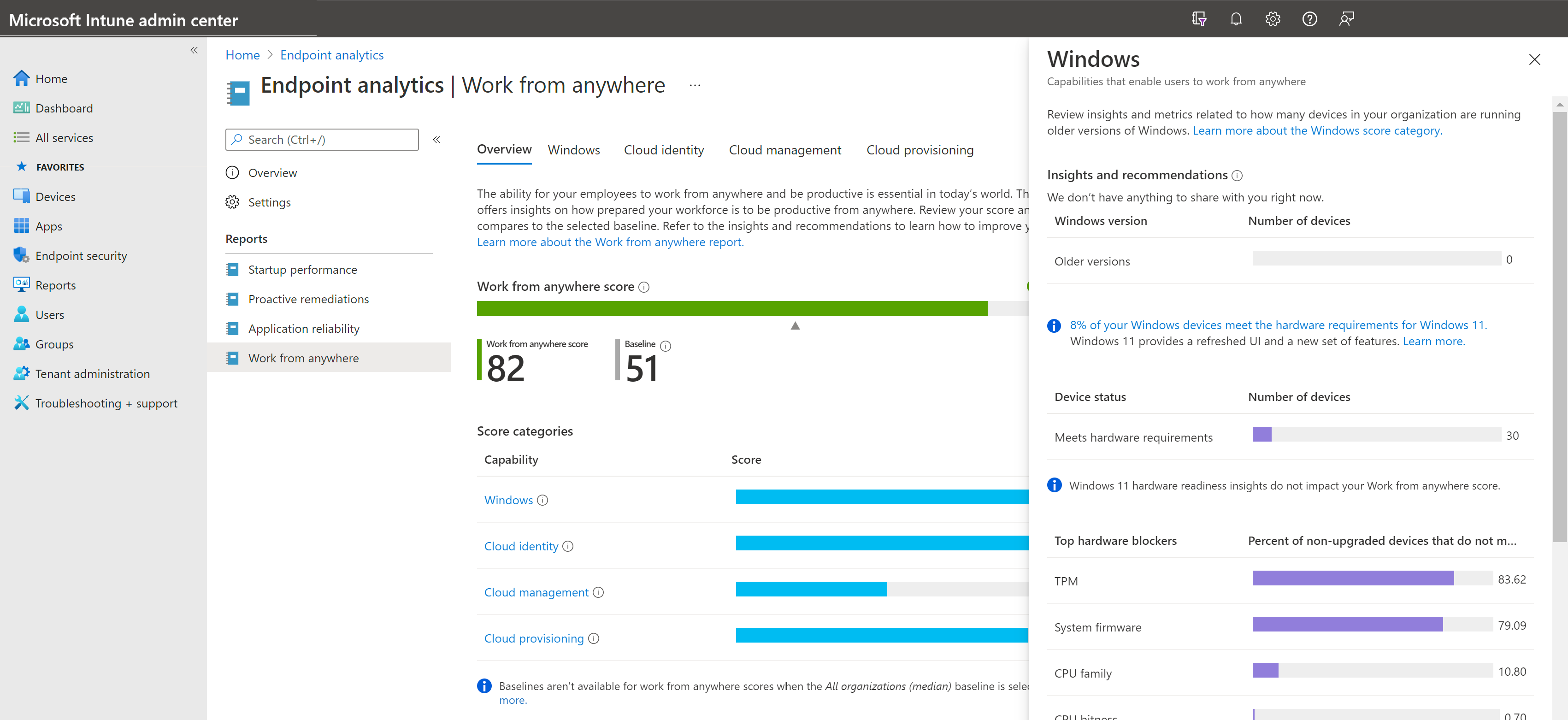 В Центре администрирования Microsoft Intune выберите Отчеты>Аналитика конечных> точекРабота из любого места.