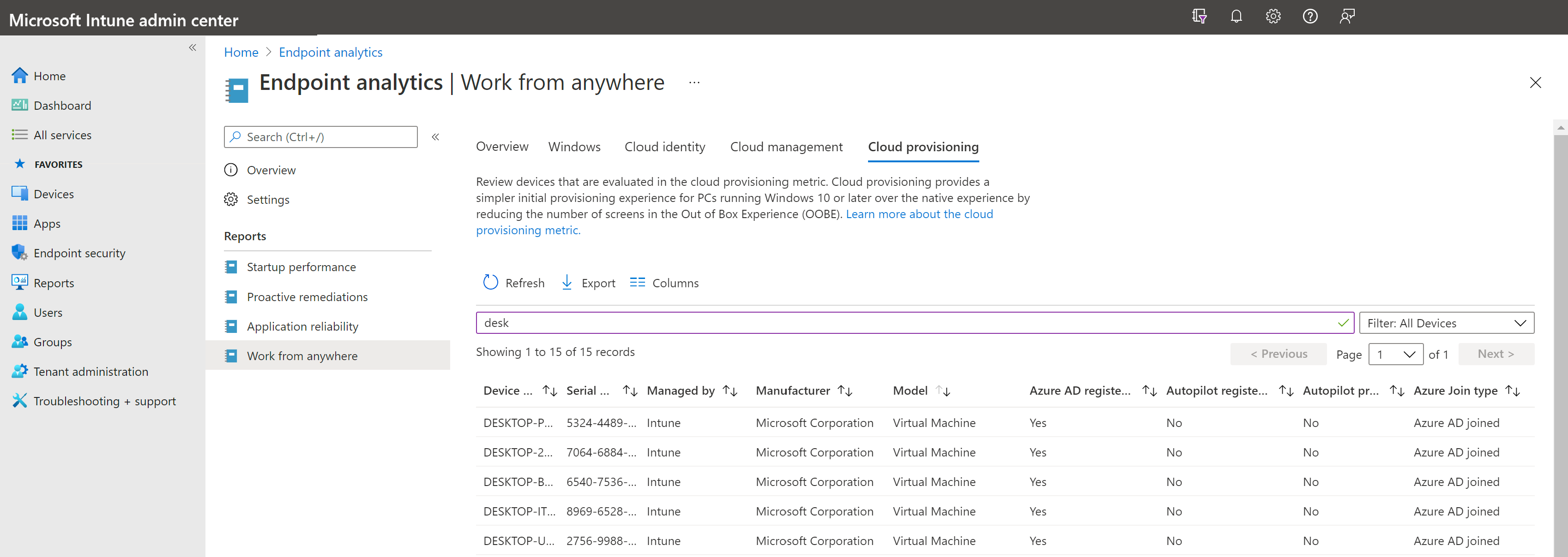 Подготовленные в облаке устройства, которые не зарегистрированы в аналитике конечных точек, не будут заполнены.