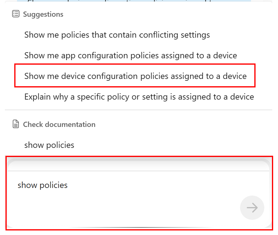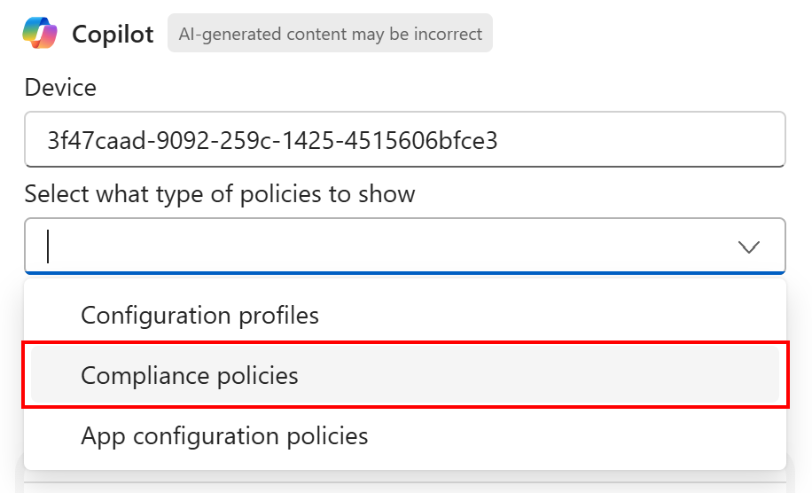 В Центре администрирования перейдите в раздел Устройства>Все устройства и выберите любое устройство. В сеансе Copilot Chat введите show policies и выберите команду Показать политики конфигурации устройства, назначенные устройству.