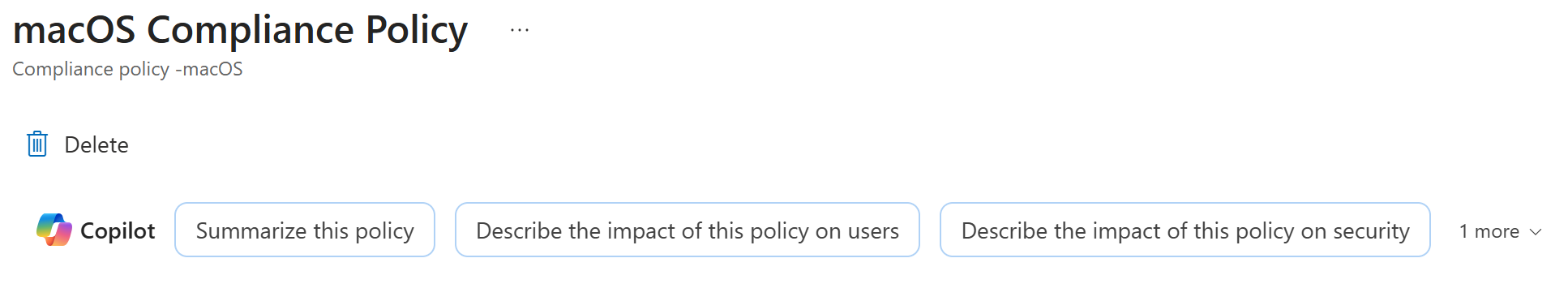 В существующих политиках соответствия требованиям Intune вы можете использовать Copilot для анализа различных аспектов политики. Руководство по запросу поможет свести итоги действий политики, влияния политики и ее параметров на пользователей, а также обеспечить безопасность. Вы также можете использовать Copilot для получения политик соответствия требованиям с конфликтующими параметрами.