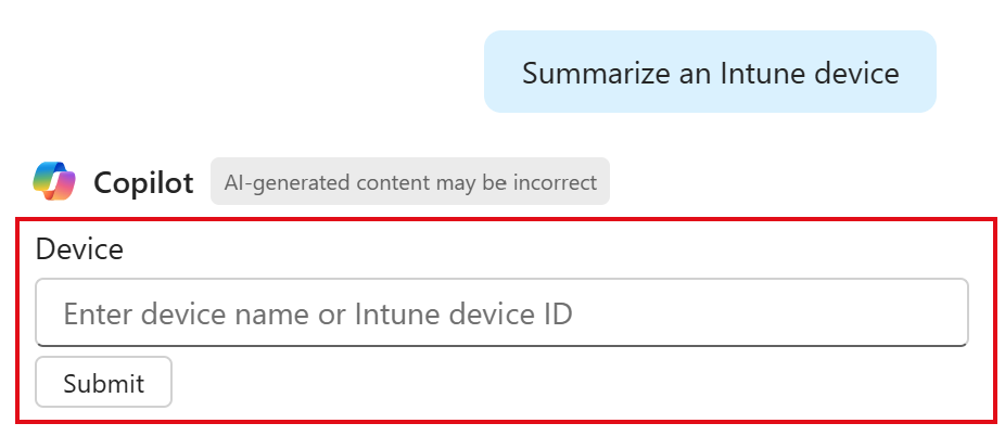 Если запрос требует дополнительных сведений, вам будет предложено ввести эти сведения. Например, если выбрать вариант Суммировать Intune устройстве, вам будет предложено ввести идентификатор устройства: