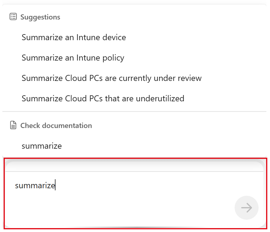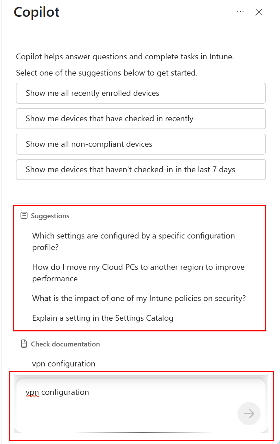 Когда Copilot Chat откроется, используйте естественный язык, чтобы задать вопрос Copilot. Интеллектуальный поиск сопоставляет запрос с доступными запросами, встроенными в Intune. Эти запросы предлагаются в качестве предложений.