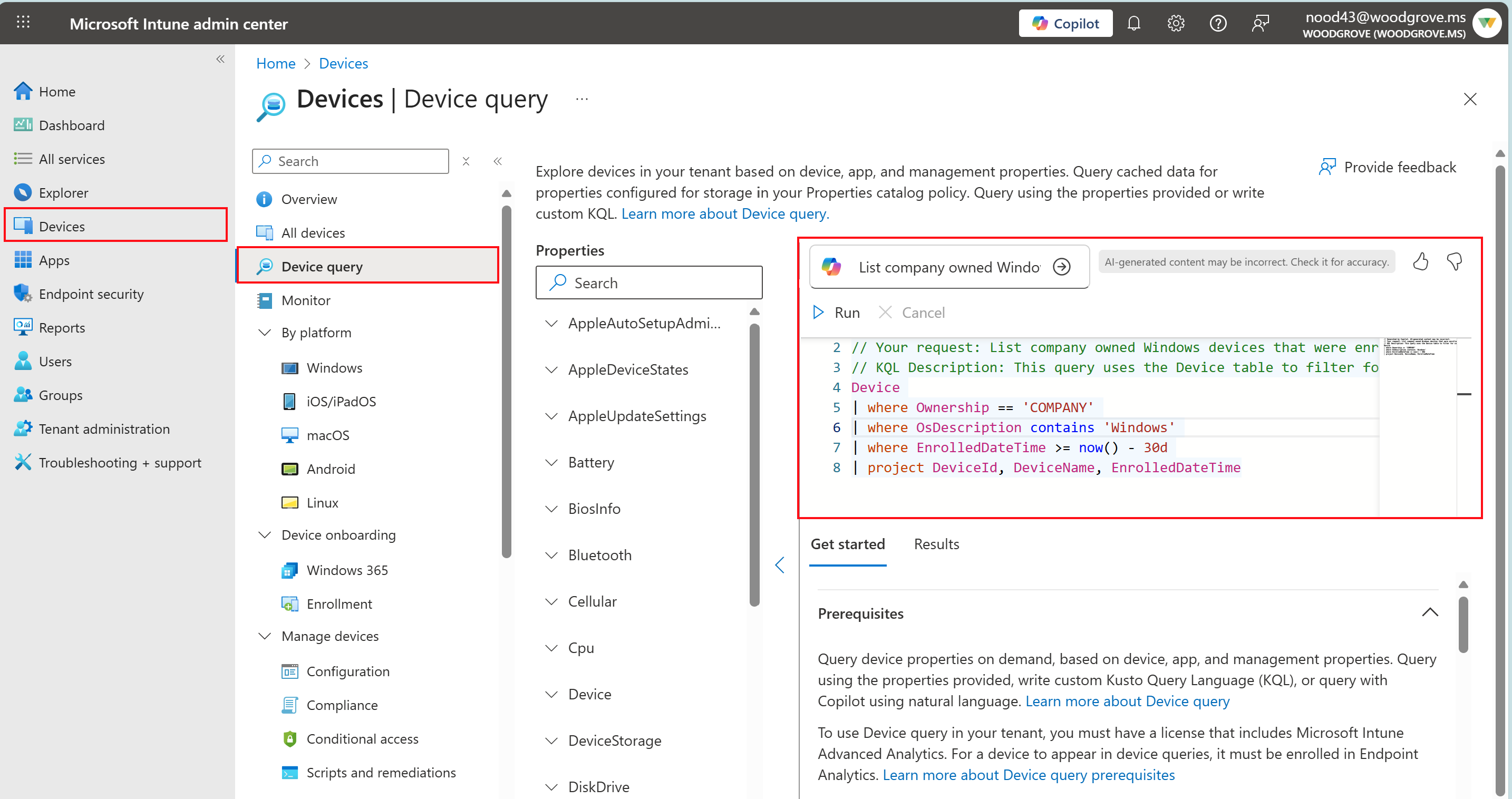 Вы можете использовать Copilot для создания запросов язык запросов Kusto (KQL), которые будут выполняться при использовании запроса устройства в Intune.