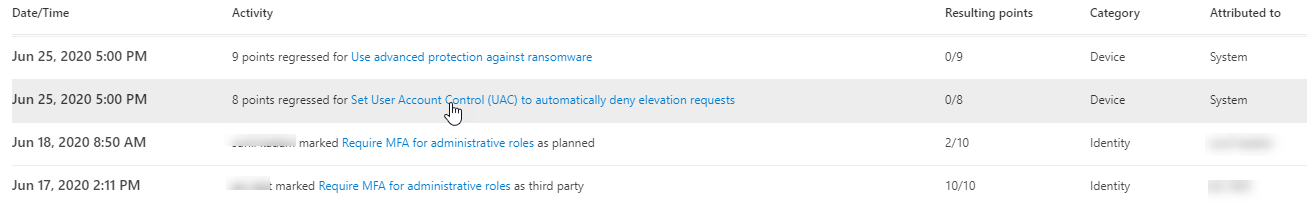 Под графиком находится список всех действий, предпринятых в выбранном временном диапазоне, и их атрибуты, такие как итоговые баллы и категория. Вы можете настроить диапазон дат и фильтровать по категориям.