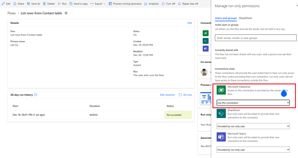 Добавляйте совладельцев для совместной работы в потоках только по мере необходимости. В большинстве случаев, если потоку необходимо предоставить общий доступ, предоставляйте к нему общий доступ с разрешениями только для выполнения, которые не позволяют пользователям просматривать журнал выполнения потока или вносить какие-либо изменения. Совместное использование потоков также позволяет владельцу указать, использует ли поток подключения пользователя, вызывающего поток, или встроенные подключения пользователя или учетной записи, создающих поток.