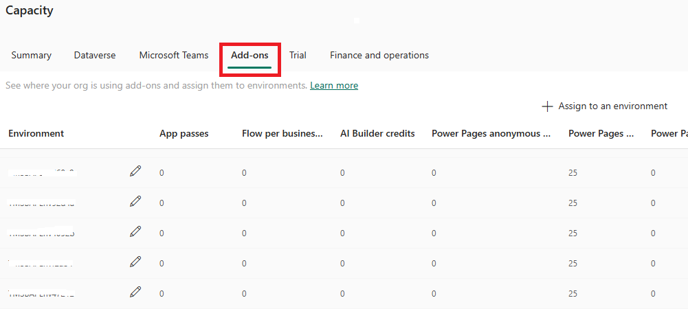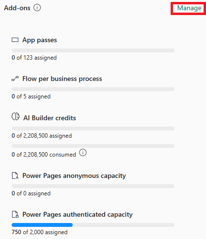 Чтобы назначить дополнения, выберите Управление. Для получения подробной информации см. Назначение или изменение емкости в среде.