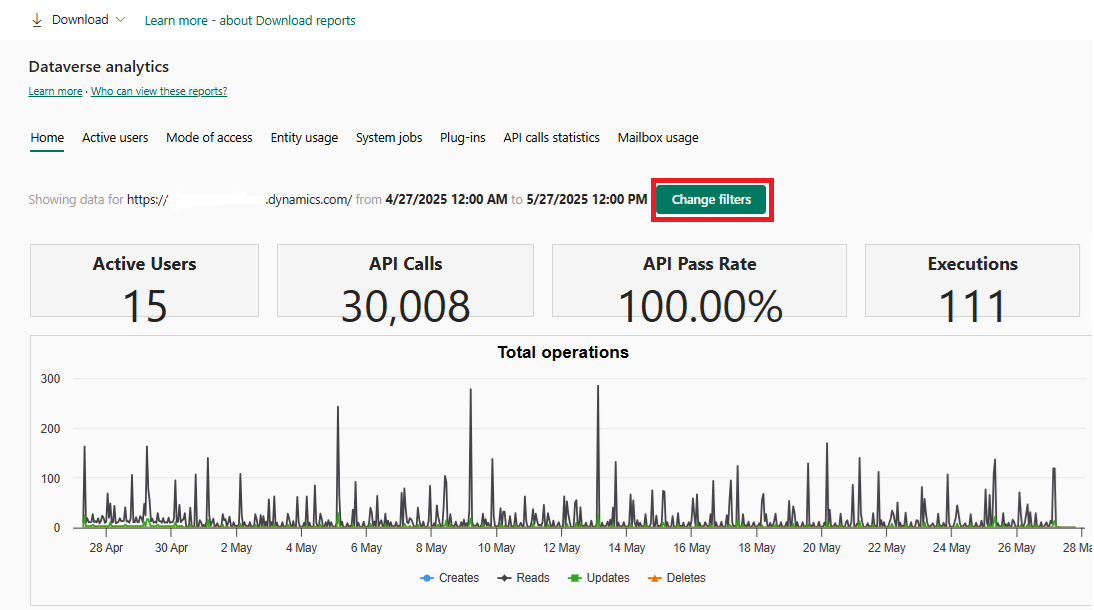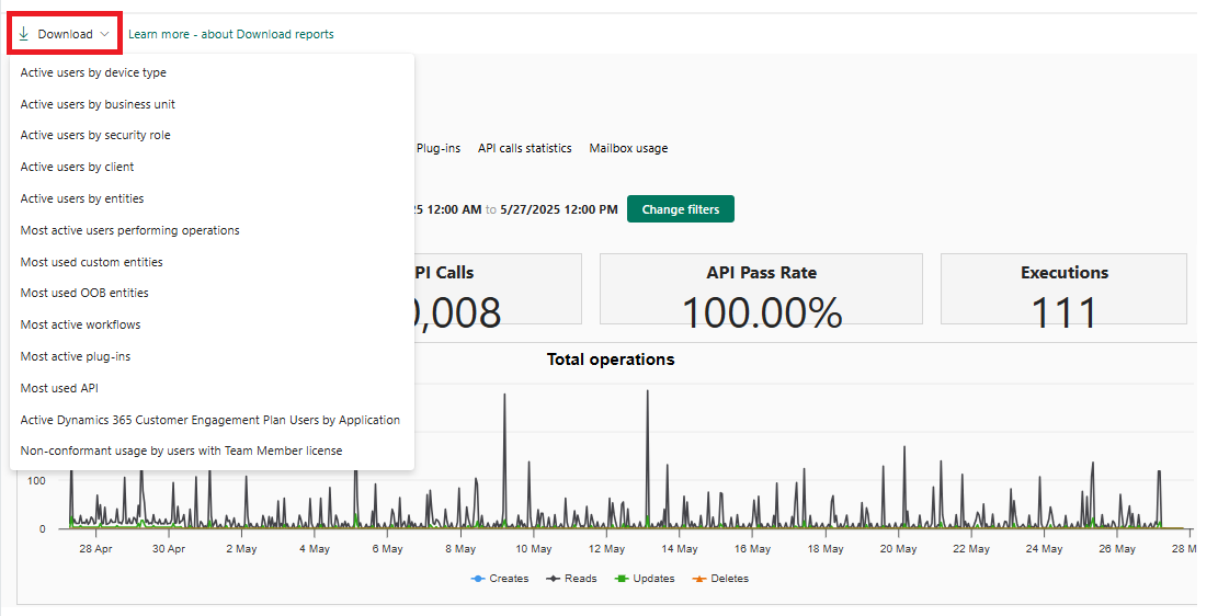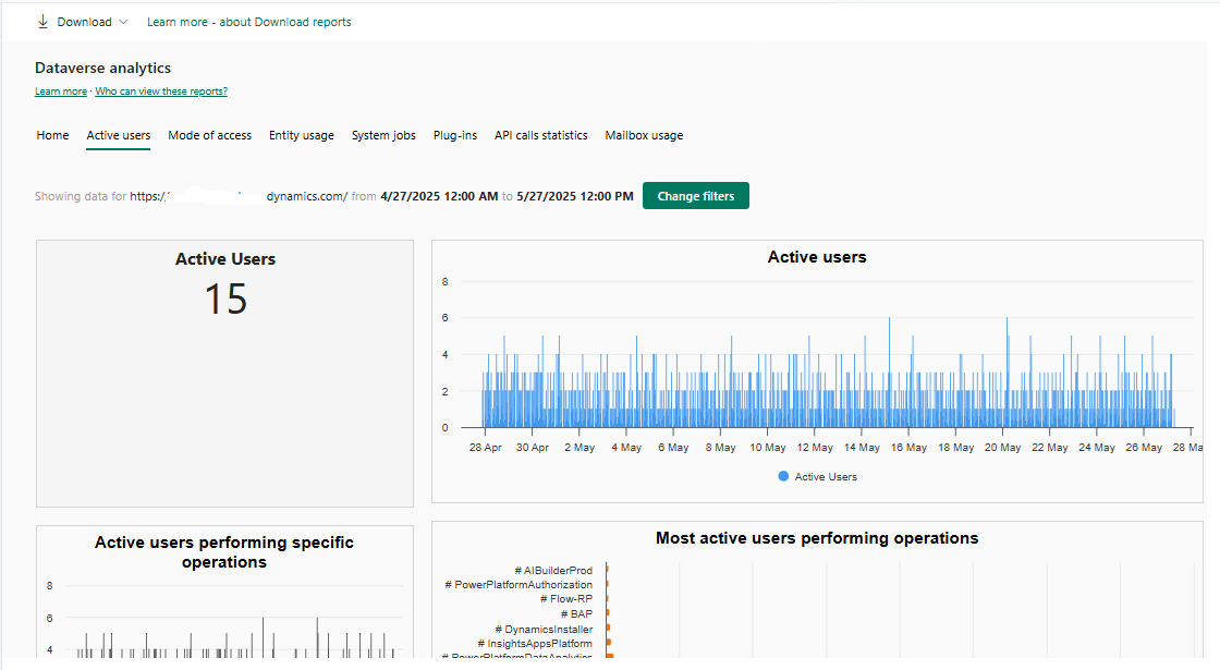 Все загружаемые отчеты, за исключением Active Dynamics 365 Customer Engagement Plan Users by Application, показывают данные для среды и по временной шкале в фильтрах для готовых Dataverse аналитических отчетов. Если вы выбираете определенный диапазон дат для готовых отчеты Dataverse, тот же фильтр времени применяется к загрузкам. Максимальная продолжительность доступности данных составляет 30 дней.