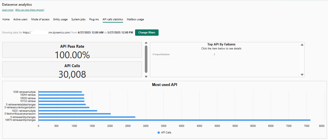 | Наиболее используемый API | Список 10 наиболее часто выполняемых вызовов API в базе данных Dataverse среды. |