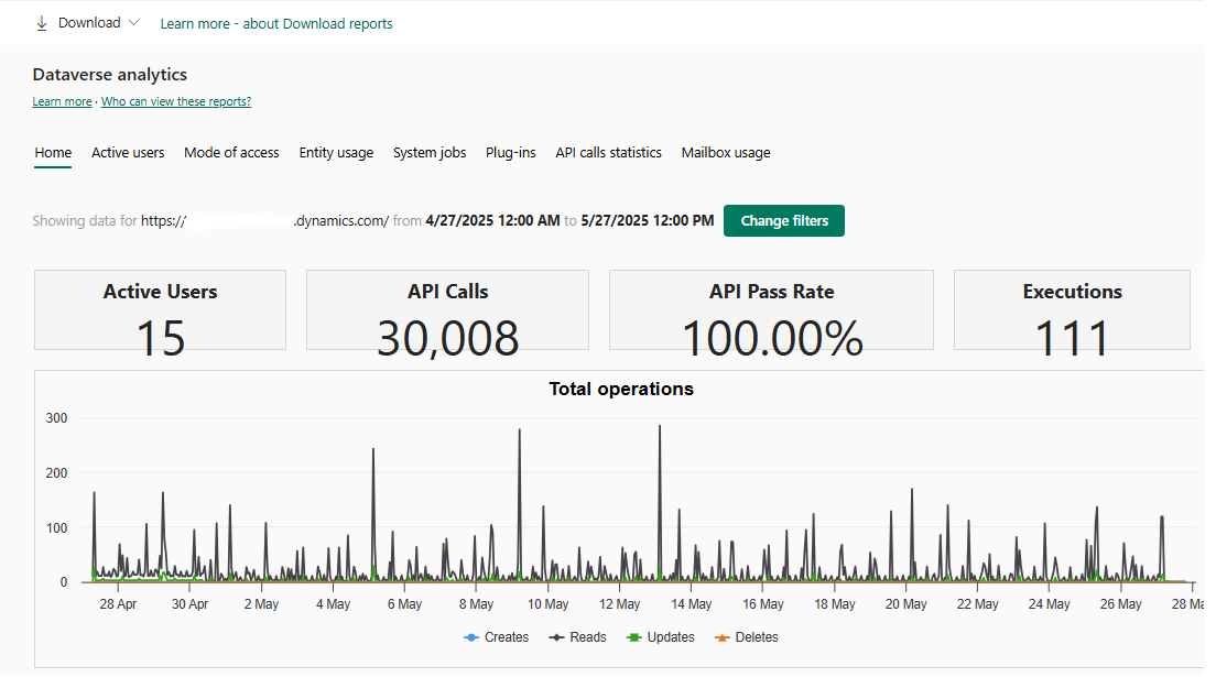 | Всего операций | Количество операций (Create, Update, Delete, Read), произошедших в среде с Dataverse базой данных за указанный период времени. |