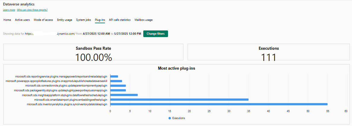 | Наиболее активные подключаемые модули | Список 10 самых исполняемых плагинов в среде с Dataverse базой данных за указанное время. |