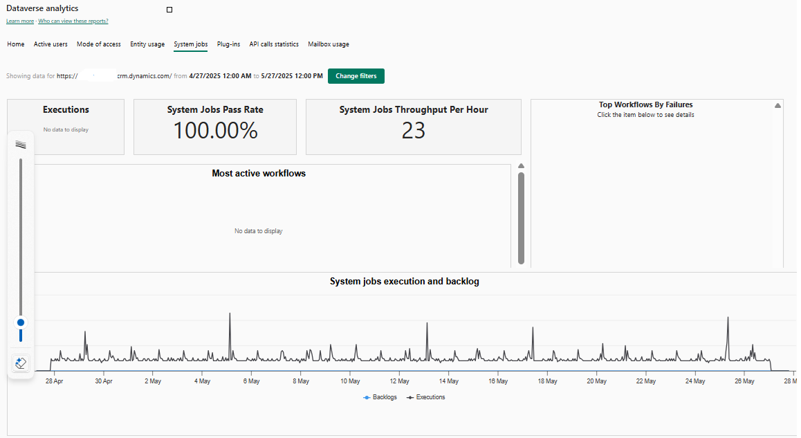 | Коэффициент успешных выполнений системных заданий | На этой диаграмме показана скорость выполнения системных заданий в процентах от числа системных заданий, выполненных в среде с Dataverse базой данных за указанное время. |