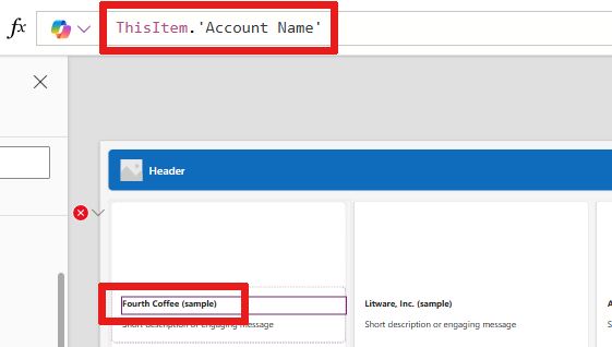 Выберите определенные элементы управления внутри галереи, такие как изображение, текст заголовка и текстовое описание. В свойствах элемента управления используйте синтаксис ThisItem, чтобы задать требуемое изображение, текст заголовка и описание.