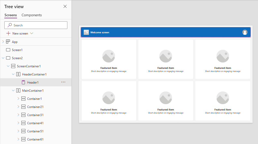 Экран приветствия идеально подходит для первого экрана приложения, где можно настроить такие плитки, как изображение, заголовок и описание. Вы можете изменить количество плиток, добавляя или удаляя их в основном контейнере. Используйте плитки для направления пользователей к другим частям приложения.