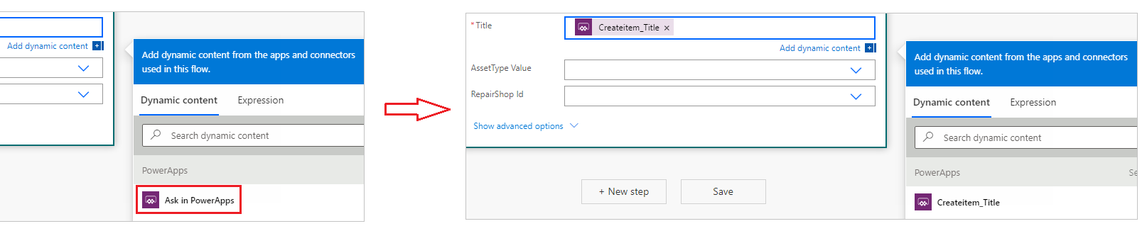 Для поля Заголовок выберите Спросить в Power Apps на вкладке Динамическое содержимое. Это действие автоматически обновляет Createitem_Title.