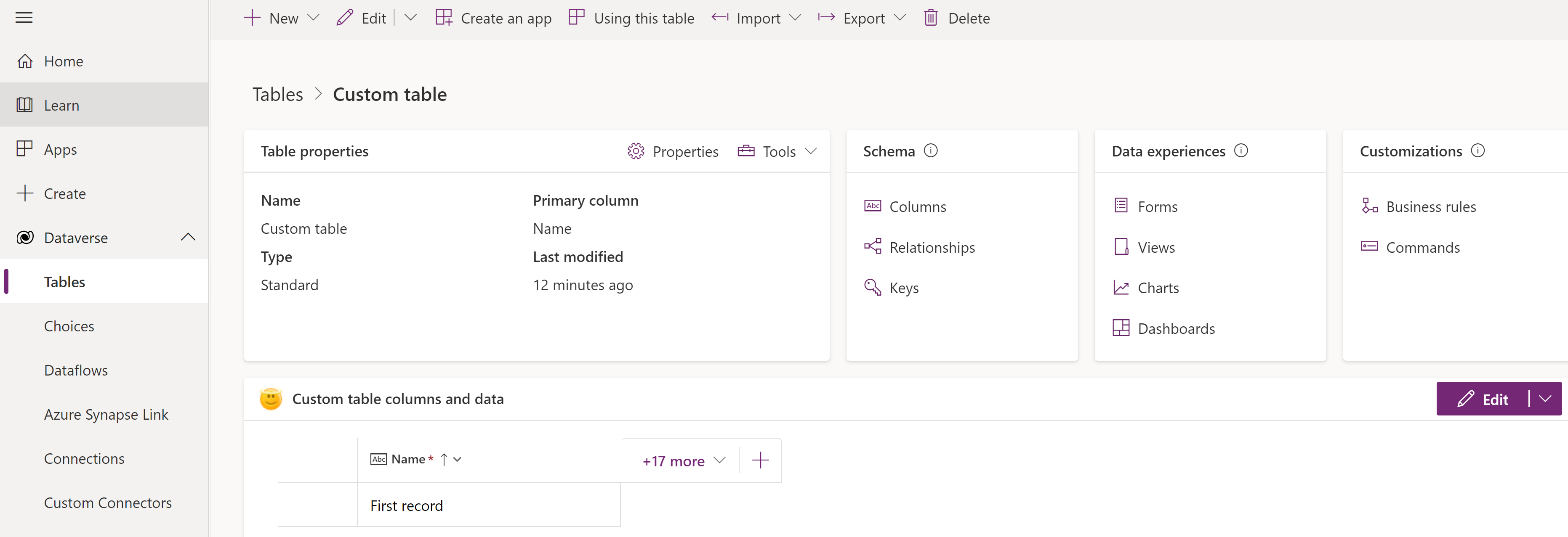 В концентраторе таблиц выберите Редактировать, чтобы открыть конструктор таблиц. Конструктор таблиц позволяет вносить обширные изменения в таблицу, включая редактирование или добавление новых записей и столбцов, редактирование свойств таблицы или создание приложения на основе модели на основе таблицы.