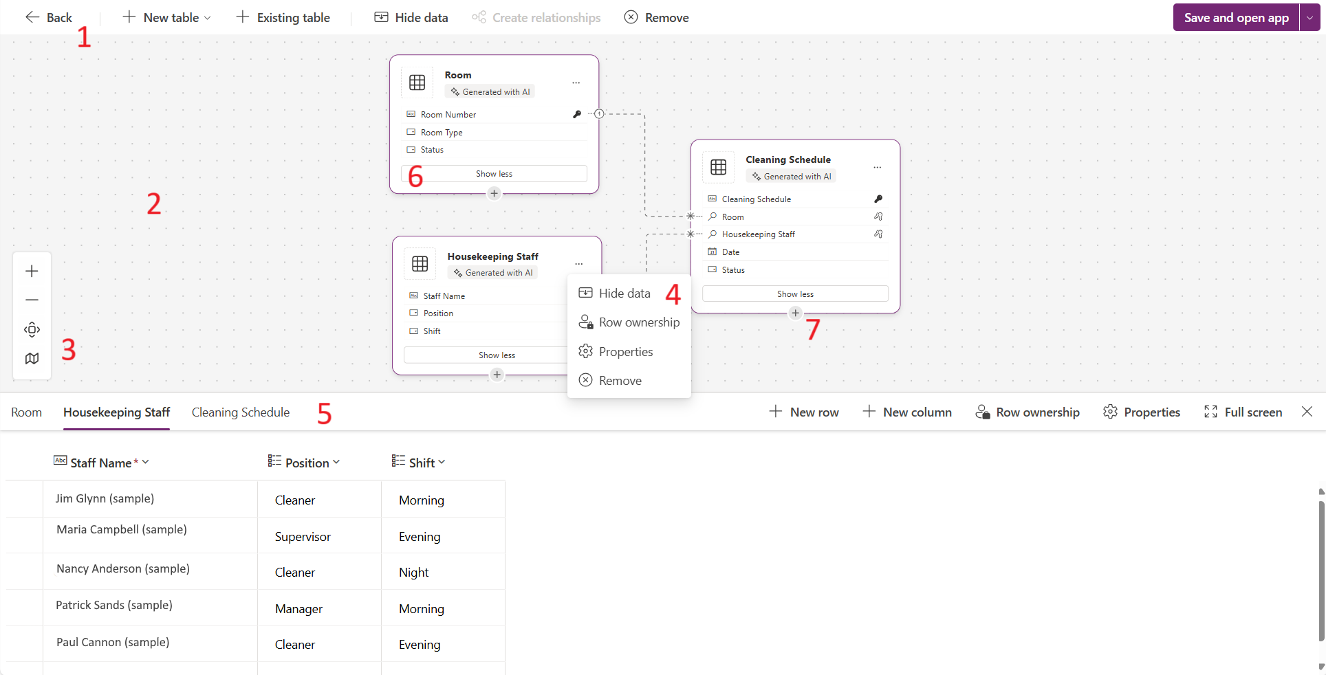 2. Полотно рабочей области данных. На холсте рабочей области данных можно перетащить таблицы по рабочей области данных, чтобы переместить их и выбрать ... чтобы вызвать меню действий таблицы и просмотреть схему данных.