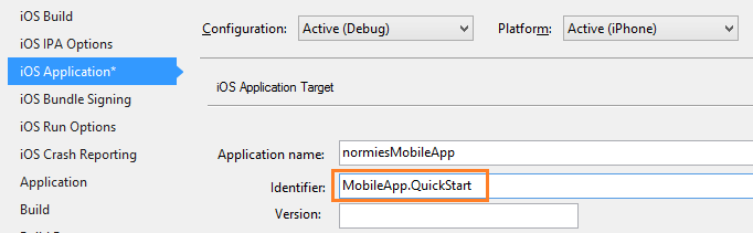 На страницах свойств щелкните вкладку приложения iOS и обновите идентификатор с идентификатором, созданным ранее.