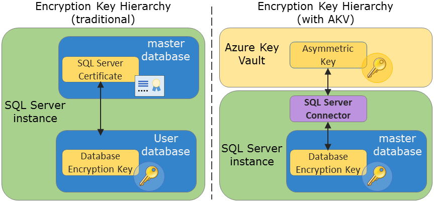 SQL Server предоставляет несколько типов шифрования, которые помогают защитить конфиденциальные данные, включая прозрачное шифрование данных (TDE),шифрование столбца данных (CLE) и шифрование резервных копий. Во всех этих случаях в рамках этой традиционной иерархии ключей данные шифруются с помощью симметричного ключа шифрования (DEK). Ключ шифрования симметричного данных дополнительно защищен путем шифрования его с помощью иерархии ключей, хранящихся в SQL Server.
