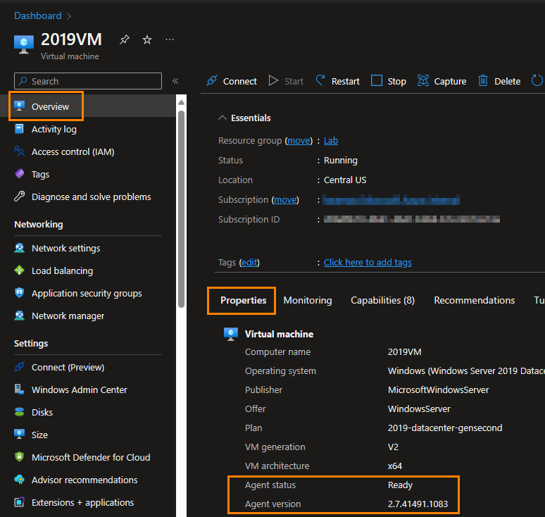 Пока вы еще находитесь на странице Обзор виртуальной машины на портале Azure, перейдите на вкладку Свойства. Если поле состояния агента имеет значение Готов, убедитесь, что значение поля версии агента соответствует минимально поддерживаемой версии. На следующем снимку экрана показано, где можно найти эти поля.