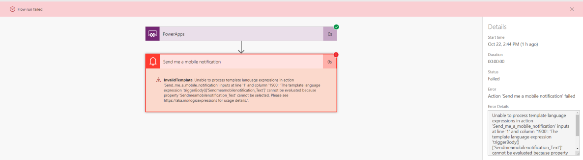 Не удается обработать выражения языка шаблона в действии "Send_me_a_mobile_notification" входных данных в строке "1" и столбце "1900": "Выражение языка шаблона "triggerBody()['Sendmeamobilenotification_Text']" не может быть оценено, так как свойство "Sendmeamobilenotification_Text" не может быть выбрано. Дополнительные сведения об использовании см. в разделе
