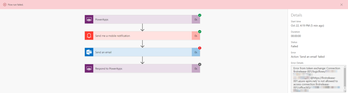 Некоторые потоки Power Automate могут не выполняться в Power Apps, и может появиться ошибка, аналогичная следующей в журнале выполнения потока Power Automate или телеметрии Power Apps: