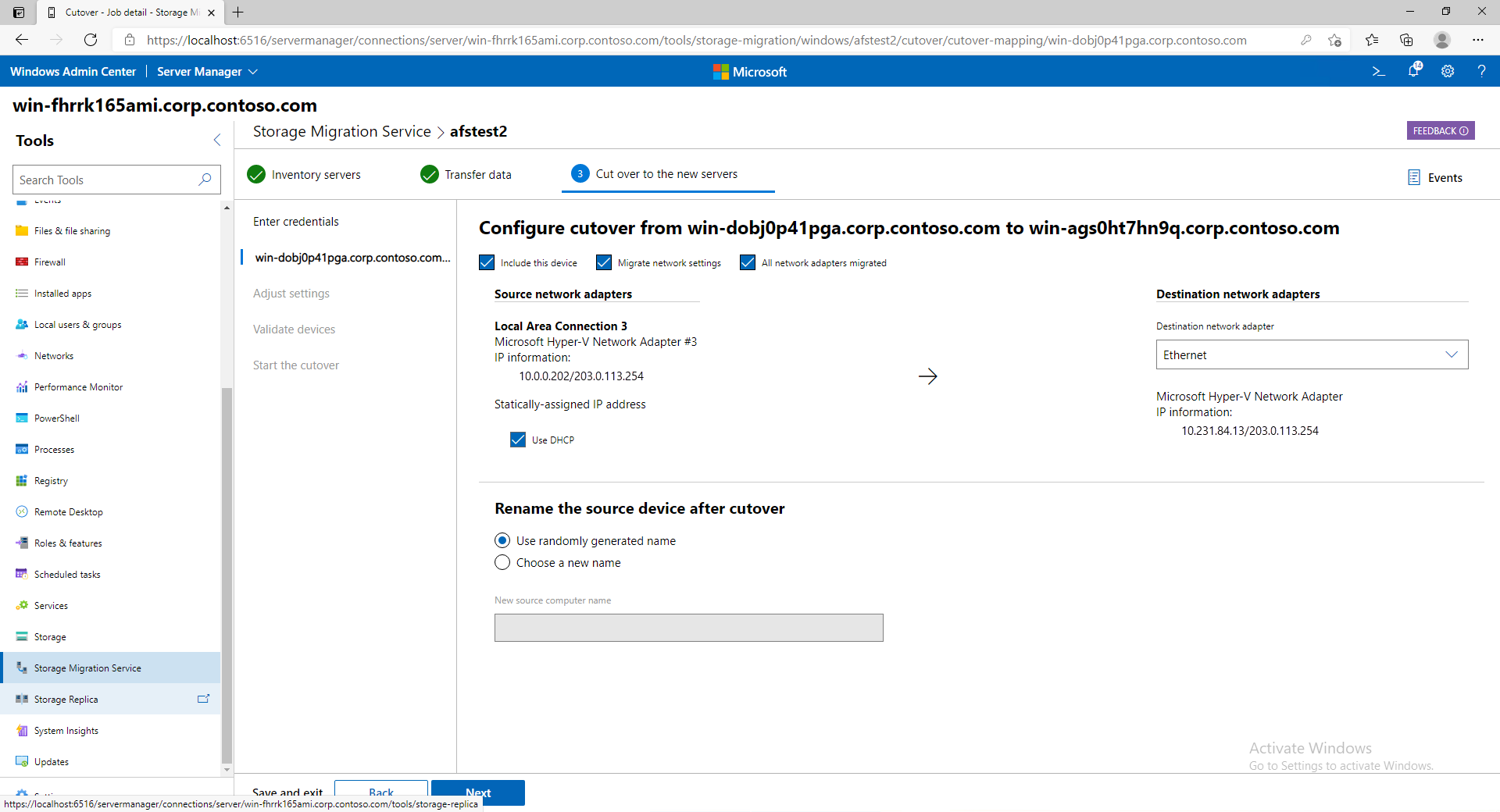 На странице настройки переключений укажите, какой сетевой адаптер в назначении должен взять на себя параметры из каждого адаптера в источнике. Этот параметр перемещает IP-адрес из источника в место назначения в рамках переключения, предоставляя исходному серверу новый DHCP-или статический IP-адрес. Можно пропустить все сетевые миграции или определенные интерфейсы.