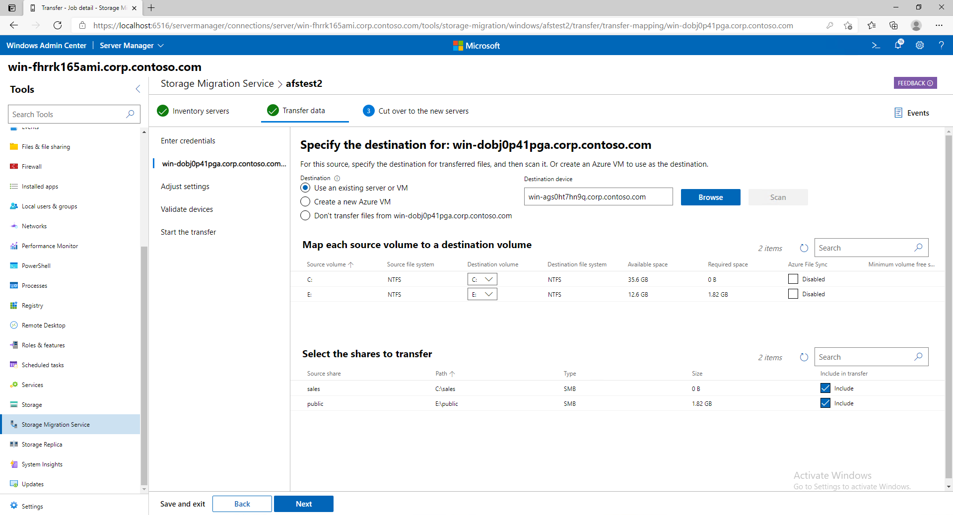 Сопоставьте исходные тома с целевыми томами, снимите флажок "Включить " для всех общих папок, которые вы не хотите перенести (включая административные общие папки, расположенные в системной папке Windows), и убедитесь, что флажок "Синхронизация файлов Azure" установлен для любых томов или общих облачных ресурсов с синхронизацией файлов Azure, а затем нажмите кнопку "Далее".